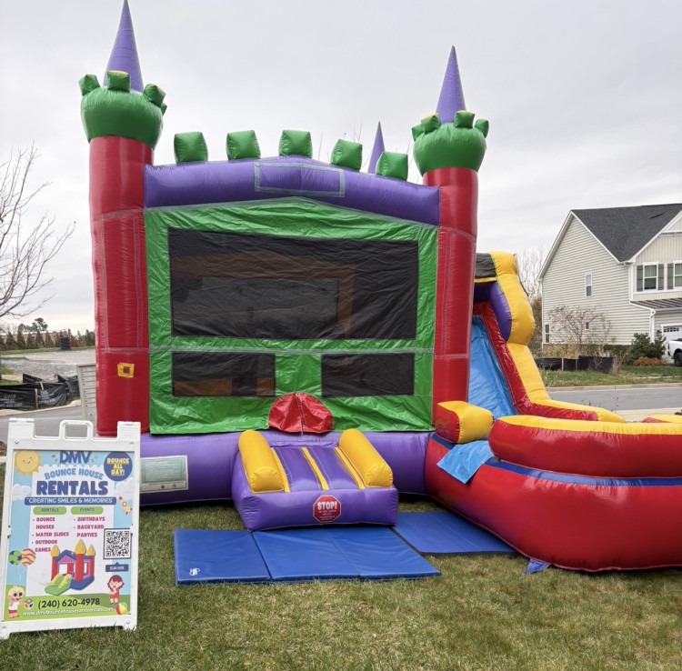 This thrilling 6-feature Combo Bouncer is perfect for your energetic party guests! 🟣🟢 Vibrantly colored in red, yellow, blue, and green, it's set to be a standout centerpiece. 🎉 Use it wet or dry! This Bounce House Combo includes a slide, climber, bounce area, small obstacle inside, hoop inside and out, making it a surefire hit at your next event. 🔆